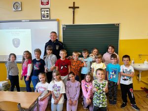 W tym miesiącu klasy 1a i 2a gościły funkcjonariusza Straży Miejskiej, który poprowadził warsztaty ,,Bezpieczna droga do szkoły”.