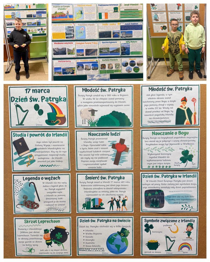 Na szkolnym korytarzu pojawiły się gazetki tematyczne przybliżające postać Świętego Patryka oraz ciekawostki o Irlandii – Zielonej Wyspie, jej symbolach i tradycjach.