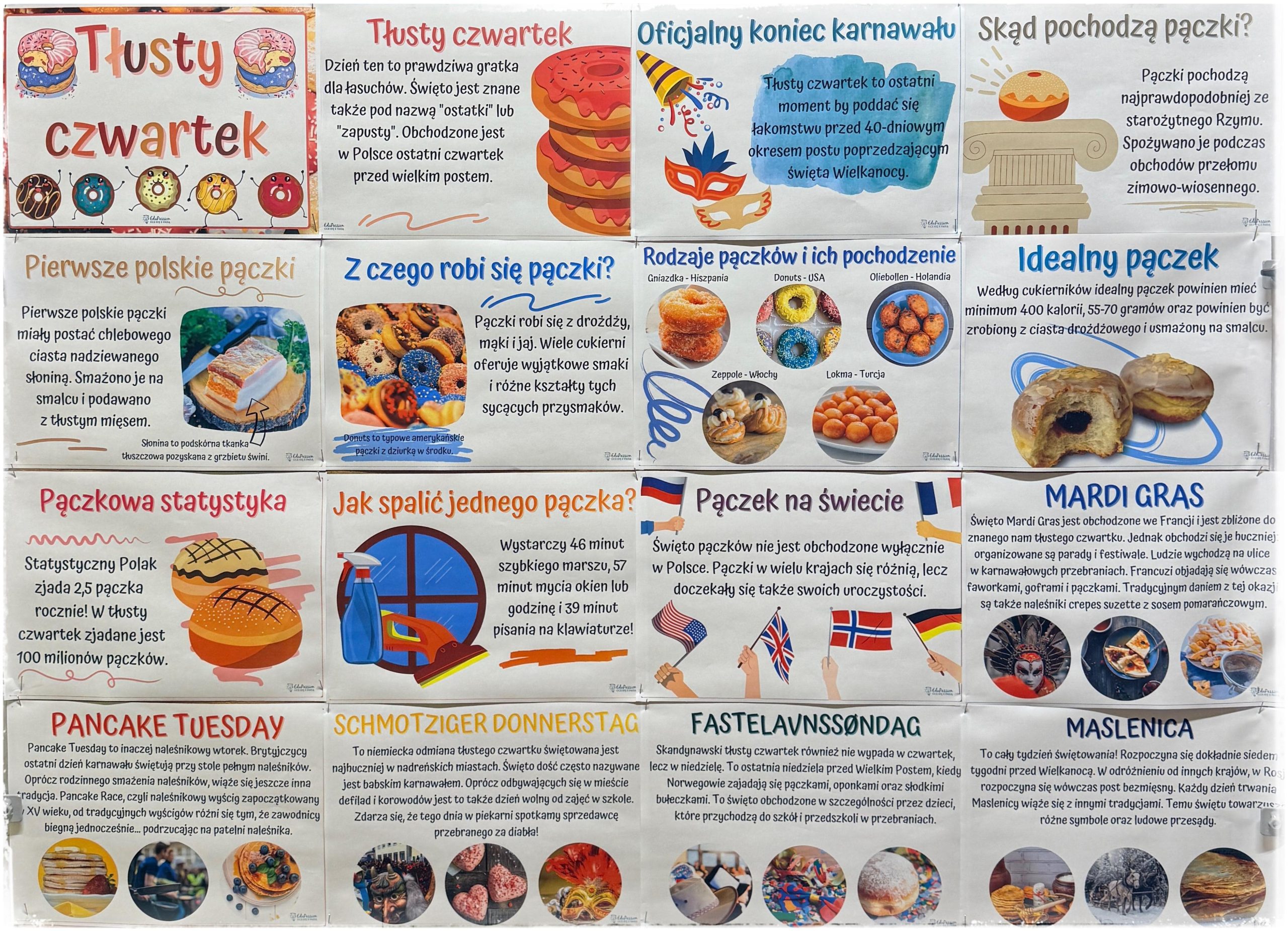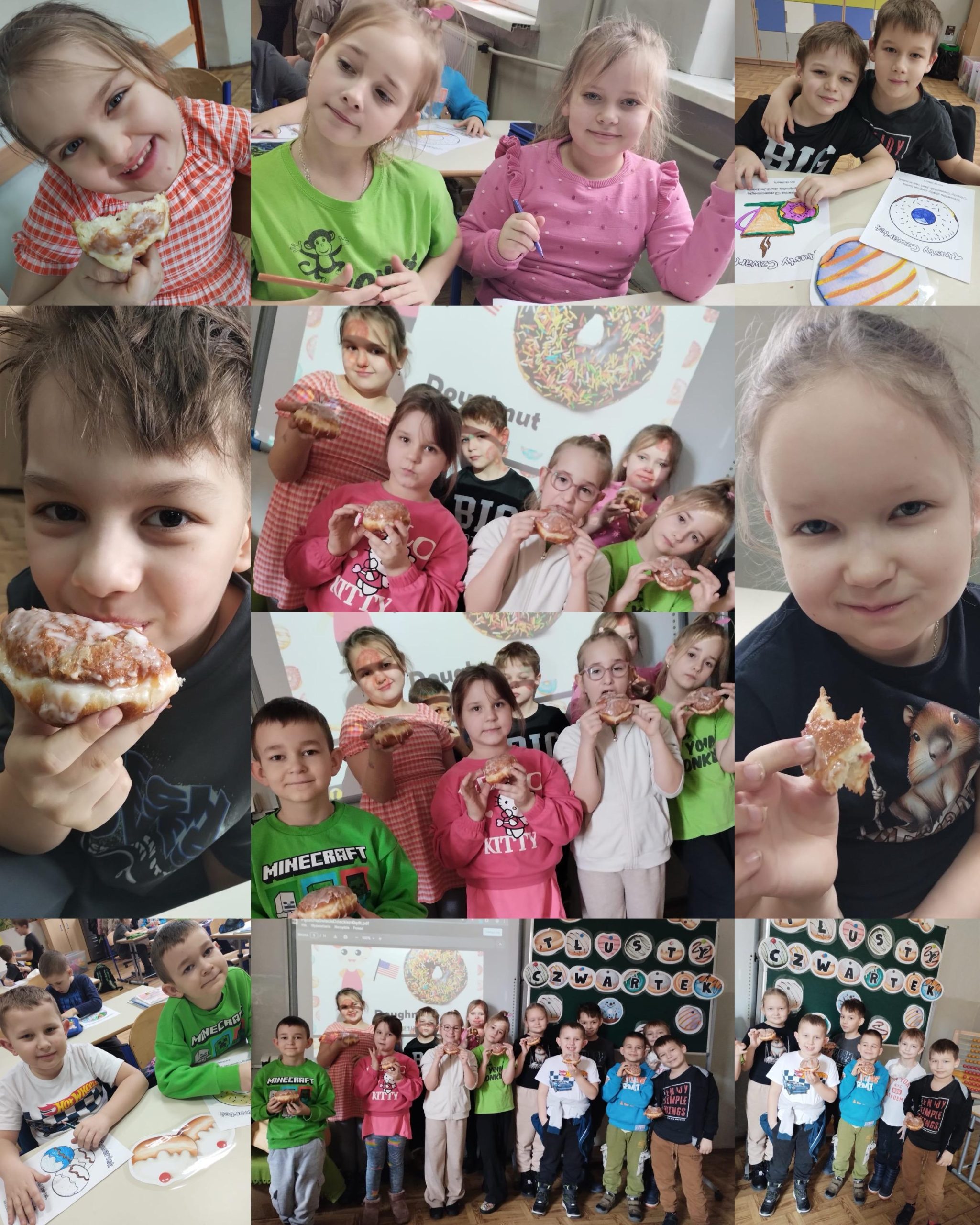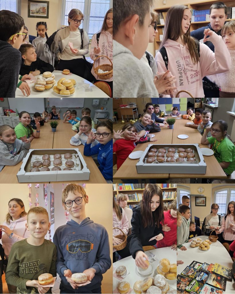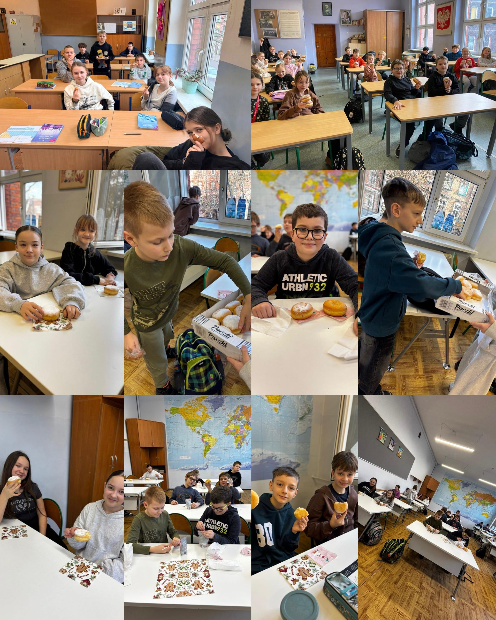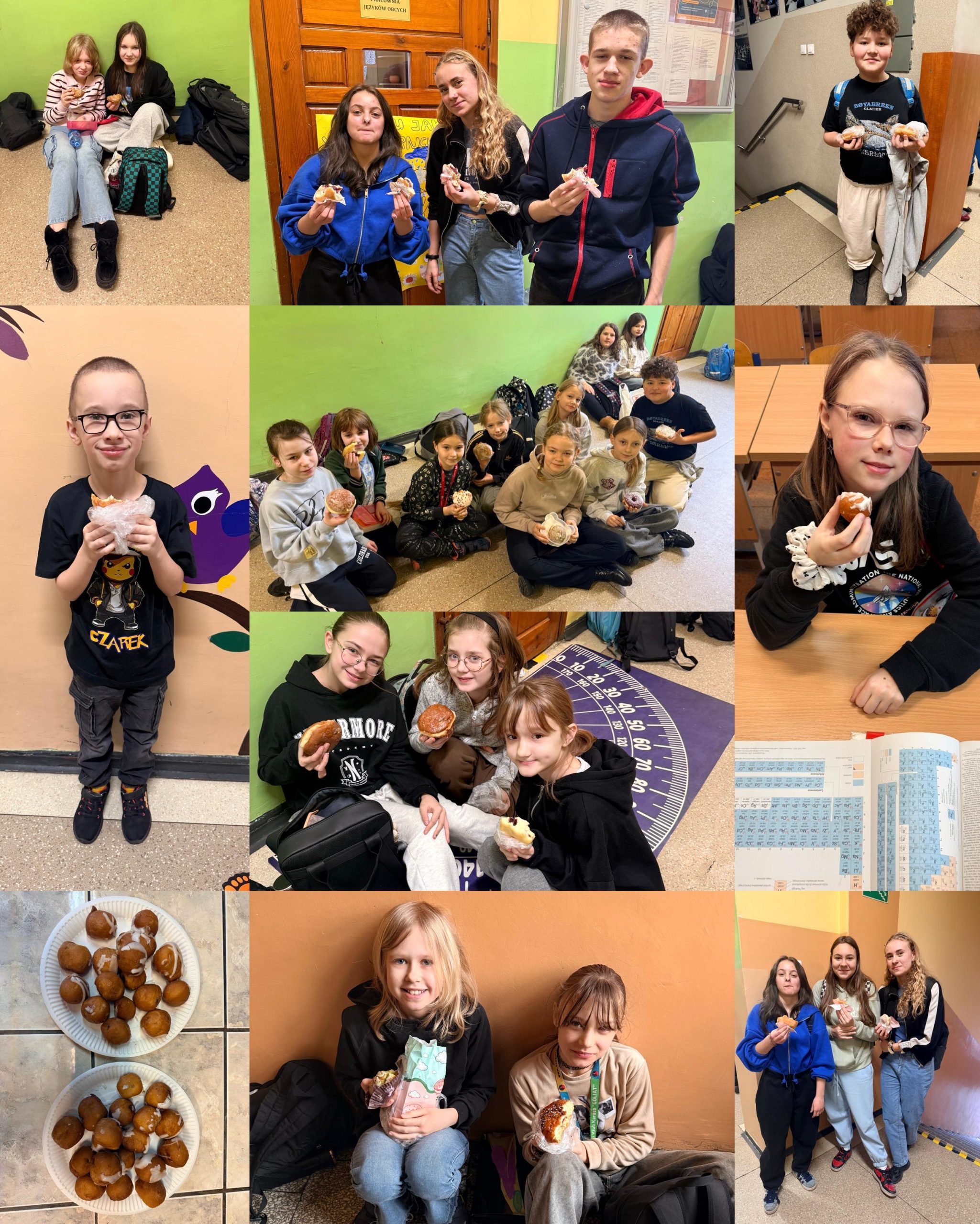 Cała społeczność szkolna włączyła się w akcję przynoszenia pączków o różnych smakach i kolorach, którymi mogliśmy delektować się podczas przerw oraz zajęć lekcyjnych związanych z tą tematyką. Była to doskonała okazja do wspólnego świętowania i integracji w wyjątkowo słodkiej atmosferze.