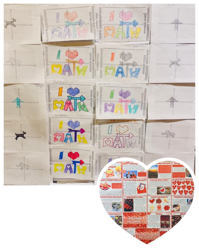 A na lekcjach matematyki również nie zabrakło walentynkowego klimatu ❤️ Uczniowie świętowali, tworząc ze współrzędnych hasło „I love Math”, a ich prace ozdobiły również szkolny korytarz — bo jak widać, do liczb też można poczuć sympatię! 🙂
